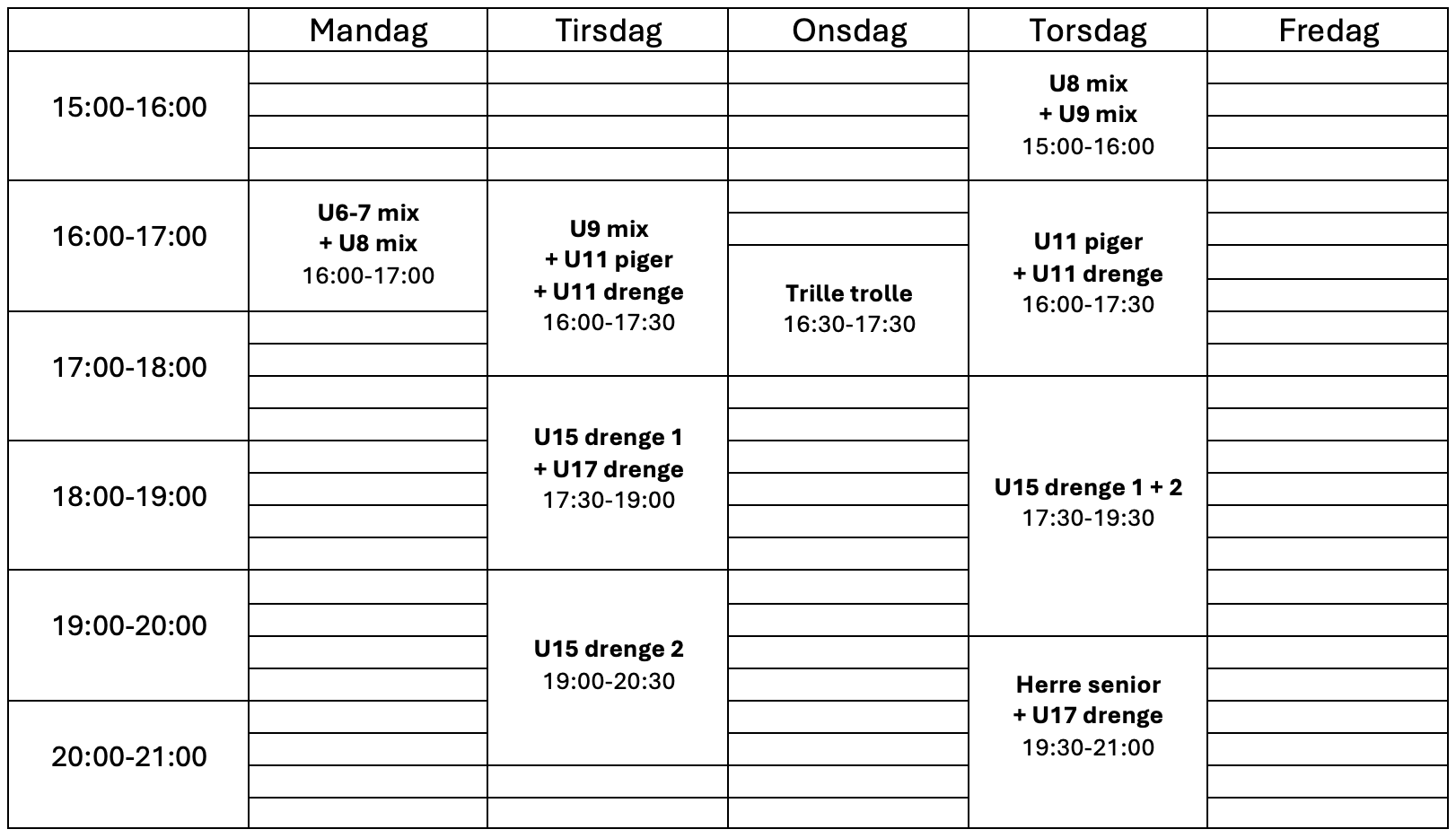 Træningstiderne er gældende indenfor sæsonen, som typisk strækker sig fra august til april. Tag fat i den enkelte træner, hvis du ønsker info om hvornår sæsonen starter og slutter for det pågældende hold.